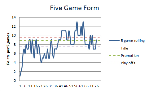Unsurprisingly, however, short term form has taken a dip since Christmas.The two defeats against Northampton and Accrington saw our form drop to below what’s needed for even the play-offs for the first time since last season. To some extent, our current position is reliant on strong early season form.