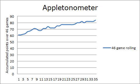 It wasn’t all plain sailing; frustrating home form and, for the first time this season, two consecutive defeats. That said, the Appletonometer actually finished the month on a high. In the 46 games to the Wimbledon win accumulated 84 points. We flatlined for most of the month, which reflects that our form was almost identical to this time last year, but the kick-up post-Wimbledon means we’re in a better position than we’ve ever been under Michael Appleton.