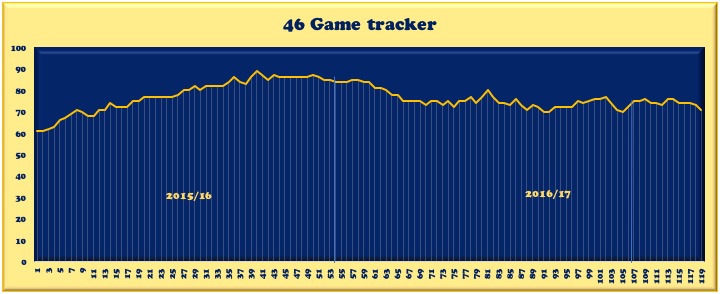 Inevitably, this has had an effect on the long term form; the number of points in the 46 game to the end of December saw us reach a low of 71, one point ahead of Appleton’s worse League 1 total of 70 but still only one point behind where we were at the end of last season.