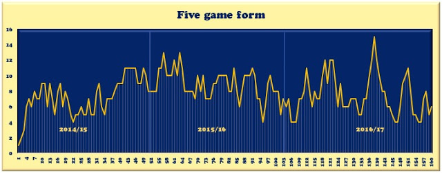 The Clotet era has been characterised by a rollercoaster of highs and lows. You can see it in the short term form graph. What is perhaps notable is that the peaks have got smaller, implying that the results, though not without their moments, have got progressively worse as the season has progressed.