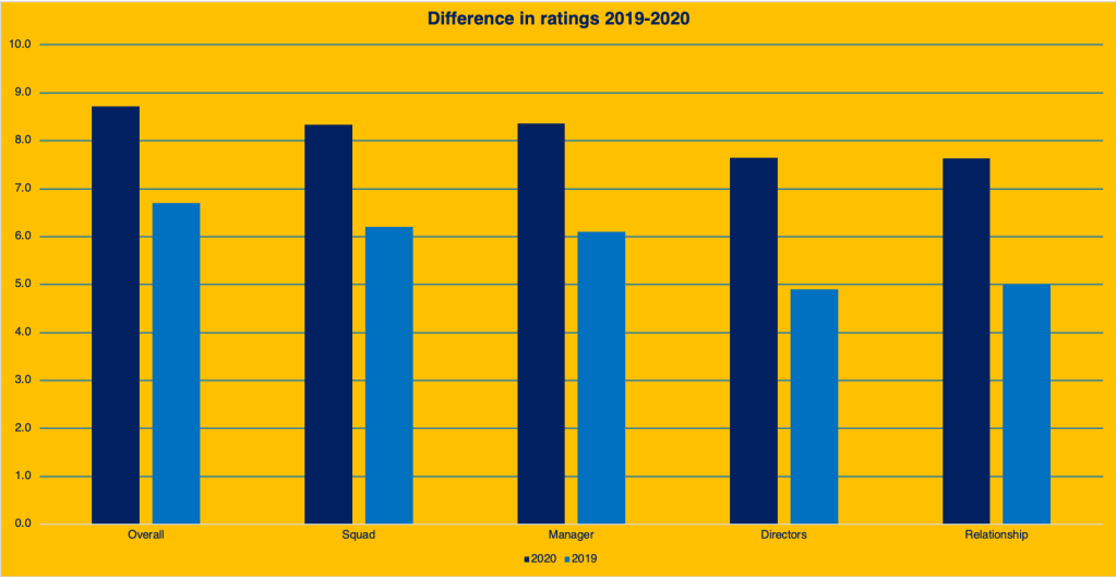 The board’s ratings lagged behind a little, which is perhaps understandable because there’s always demand for more in terms of investment as well as a general mistrust any board’s intentions. In the summer, off the back of multiple winding up orders, the board were rated just 4.9 out of 10, mid-season it has risen to 7.6.
