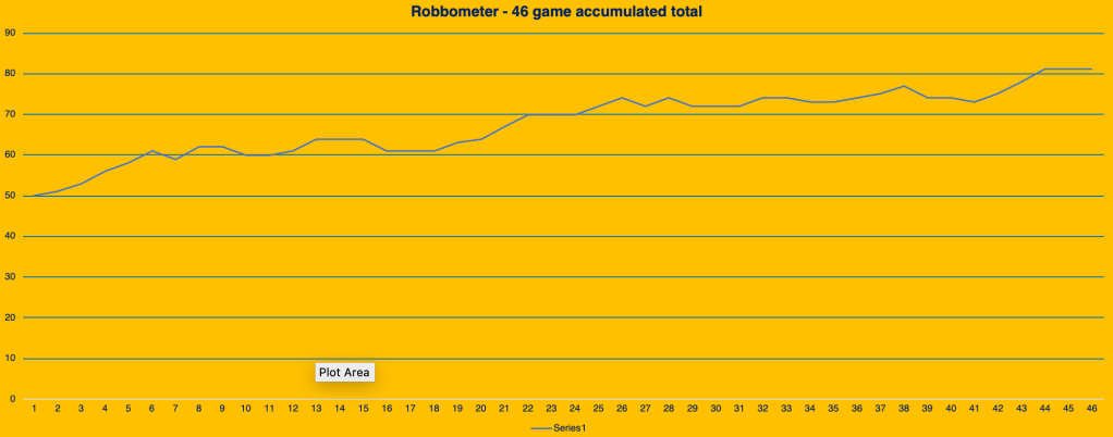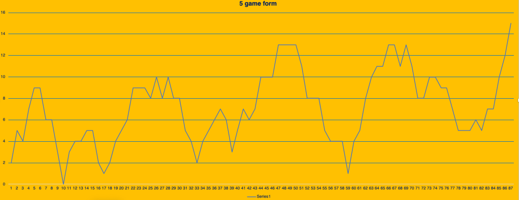Though this only shows short term form, it’s no freak, looking at more long term – a rolling 46 game points total – the Shrewsbury game saw us peak at 81 points. It’s worth noting that although we were on the way up, 81 points would typically be good enough for a play-off place so the idea that we were genuinely deserving of an automatic place is not a strong one.