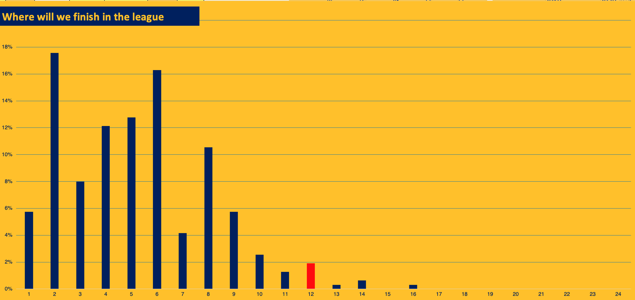 We underperformed in both cups – in the FA Cup 49% you thought we’d make the 4th Round with another 44% the fifth, but there was no charge to Wembley as we tumbled out in the first round to Peterborough. Similarly, in the League Cup, 33% expected us to make the 3rd Round, but we fell to Watford in the second. A lot, of course, depends on the draw in the cups so in the circumstances, that wasn’t a terrible showing.