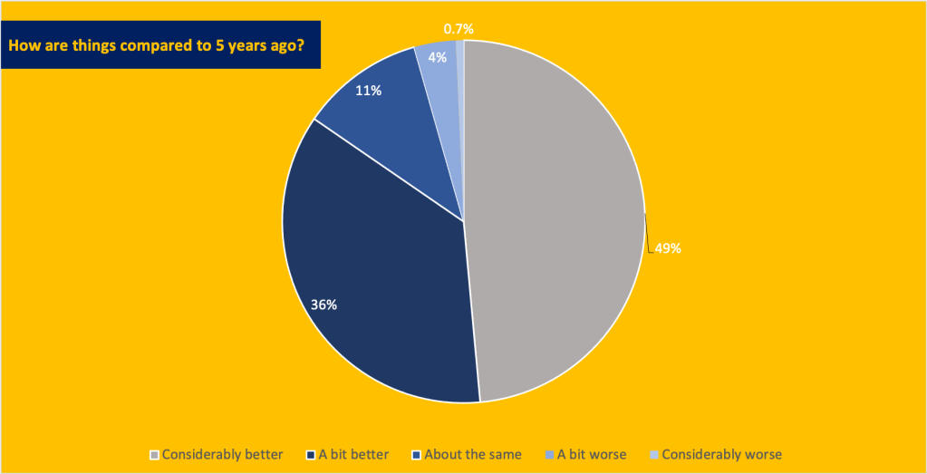 Five years ago we were still in the Michael Appleton era, even though that period was one of considerable success, there’s a strong appreciation of the progress the club has made since. 49% of respondents think things are considerably better than they were and another 36% see it as a bit better.