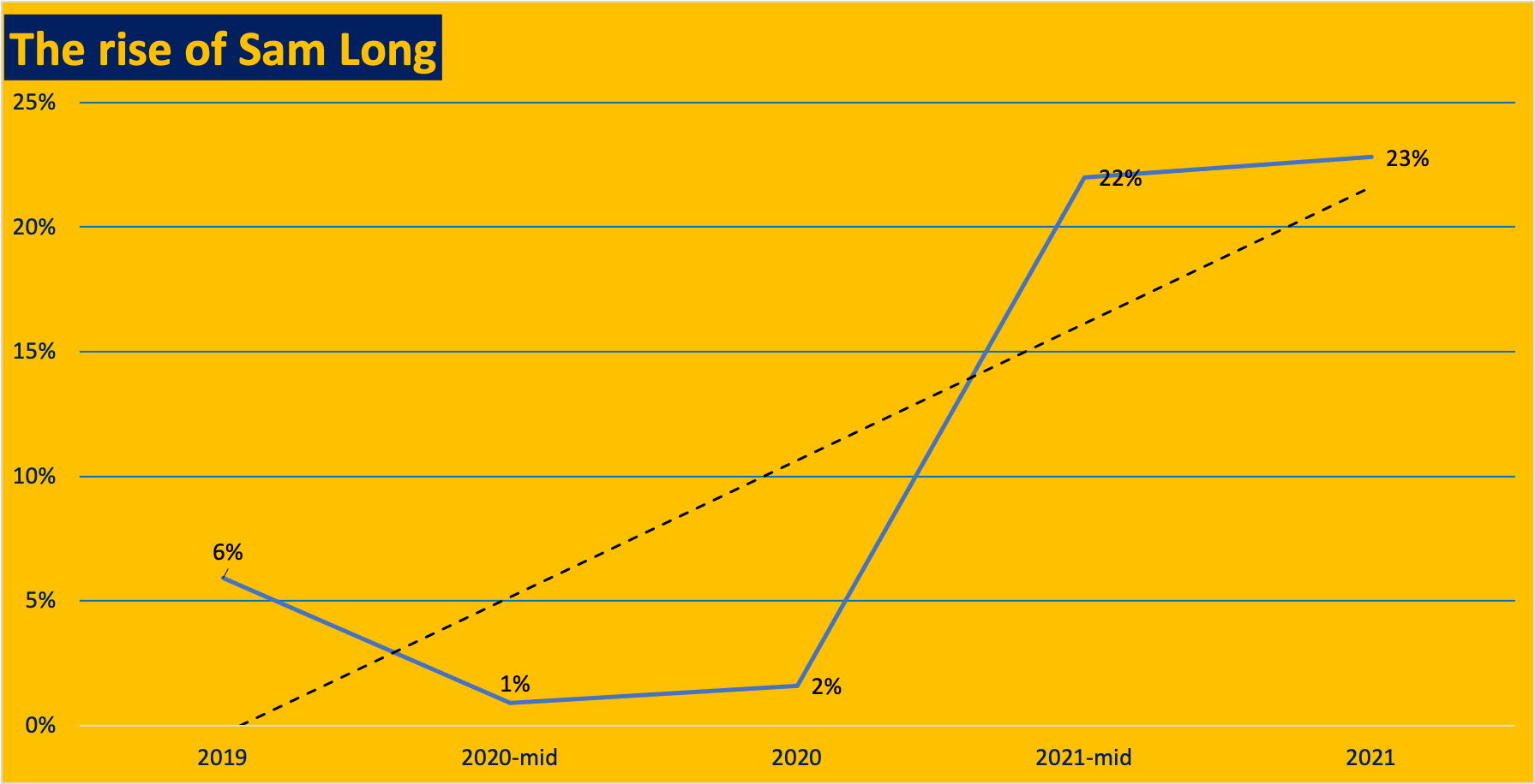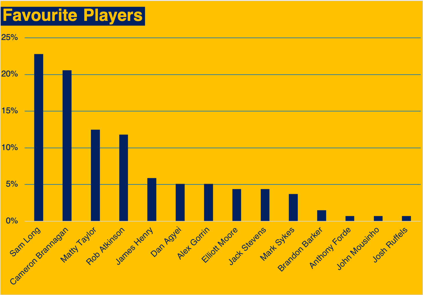 Two players dominated the voting when it came to your favourite player. Cameron Brannagan picked up just over 20% of the votes. He’s been in the top two favourite players in each of the end-of-season votes. Top, of course, was Sam Long, who, like Brannagan, is one of the few ever-presents in the survey. Unlike Brannagan, Long’s rise up the rankings has been nothing short of remarkable; 18 months ago he picked up less than 1% of the vote – in fact in my mean-spirited and discontinued question about your least favourite player in 2019, he picked up 6% of your votes, in the latest survey he picked up 23% of the votes. Quite a turnaround.