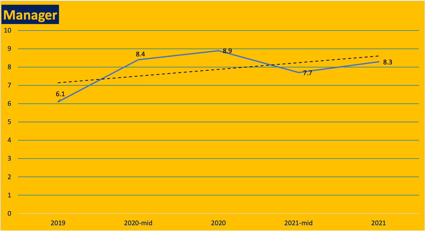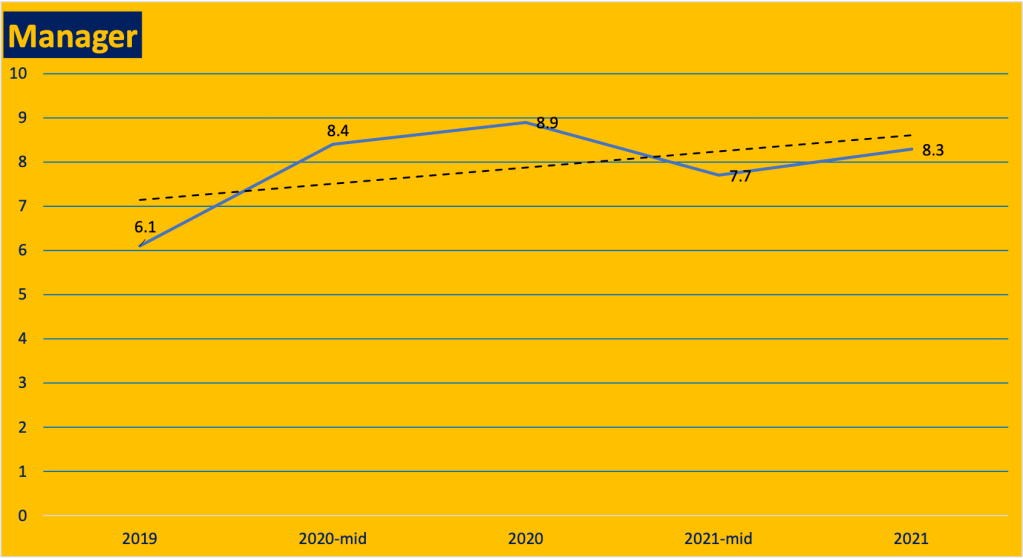 Karl Robinson continues to track positively even if he didn’t fully recover from the early season sluggishness which saw him rated as 7.7 at Christmas. He’s recovered to 8.3, a bit behind where he was this time last year but a world away from the 6.1 he got back in 2019.