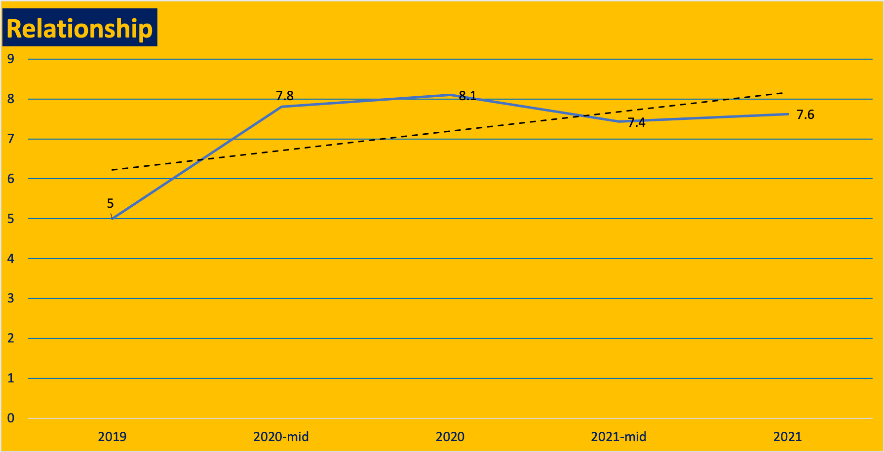 Curiously, the relationship between the club and the fans doesn’t track with on-field factors like the players or manager as you might expect. There’s a far closer relationship between the performance of the directors. The last two results, 7.4 in January and 7.6 now is identical to the scores of the directors. Is it that, deep down, success is really determined by what happens off the field.