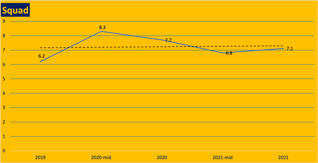 The overall squad rating has dropped back on this time last year coming in at 7.1 compared to 7.7. There is still a lot of faith in the squad when you look back to 2019 when they were rated just 6.2. There is perhaps a degree of pessimism, or maybe realism, that the reality of having a breakthrough player such as Rob Atkinson is that they will leave. It’s likely that there is a concern about how long the club can sustain the pressure of having to sell a player evey season, and more importantly, replace them with someone who will be equally valuable in a couple of years time.