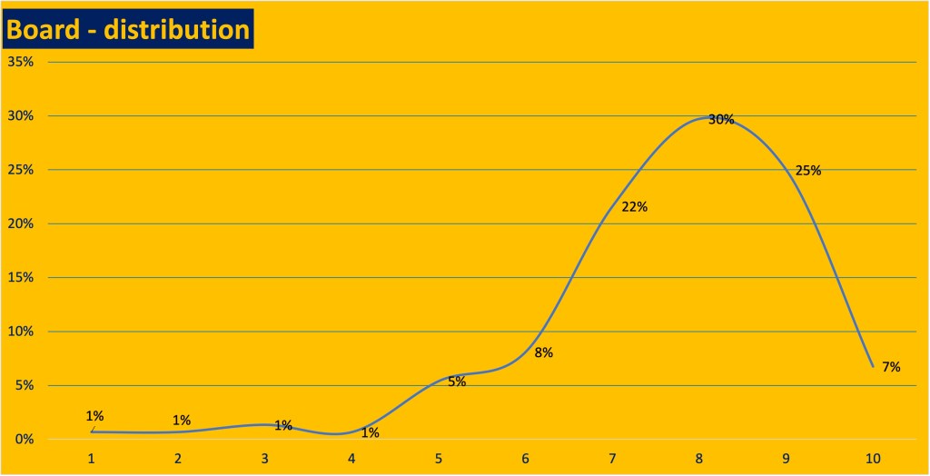 The distribution might give us more evidence of the mood around the place; there’s a strong consensus that Robinson is an objectively good manager – there’s little to suggest any movement towards wanting him to be replaced. But there’s a bit of indecision creeping in; is he an eight or a nine? Compared to last year’s curve, there is a slight shift to the left showing a very gradual loss of confidence. It’s not a trend yet, but worth keeping an eye on.