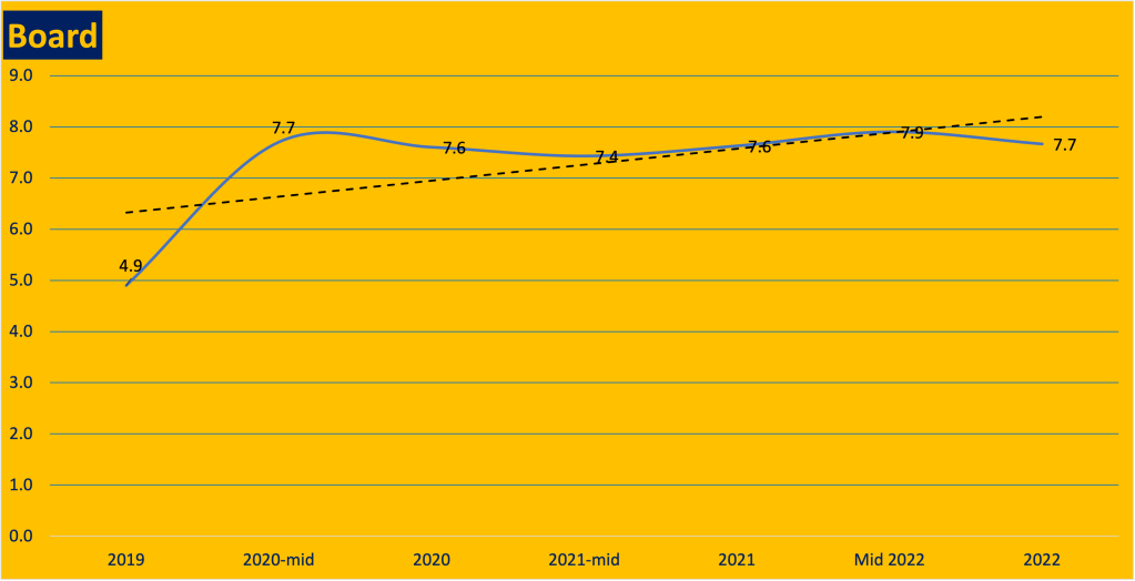 What you can see here his the growing satisfaction with our long term development. Back in 2019, the jury was out about whether the club was progressing with less than 20% thinking it was ‘considerably better’ even though we were in a higher division. Even last year, less than half thought things were considerably better, but there is quite a hop upwards for 2022.