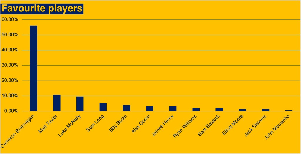 Cameron Brannagan’s dominance of the favourite player chart its pretty remarkable, polling nearly 60% of the votes. More notable still is that Matty Taylor is a distant second place despite being local and our top goalscorer. Is Brannagan moving into legend status? I can’t think of too many players who would have dominated similar polls in the past. There’s also the consistency with which he’s polled at the top of the table over the years, often being in the top-two. Now, he’s struck out on his own – the perfect combination of ability, loyalty, competitiveness and an affinity with the fans. Luke McNally came third, and was dominant in terms of the player who has developed the most, it’s a pretty amazing result given that he was a regular for little over half-a-season.