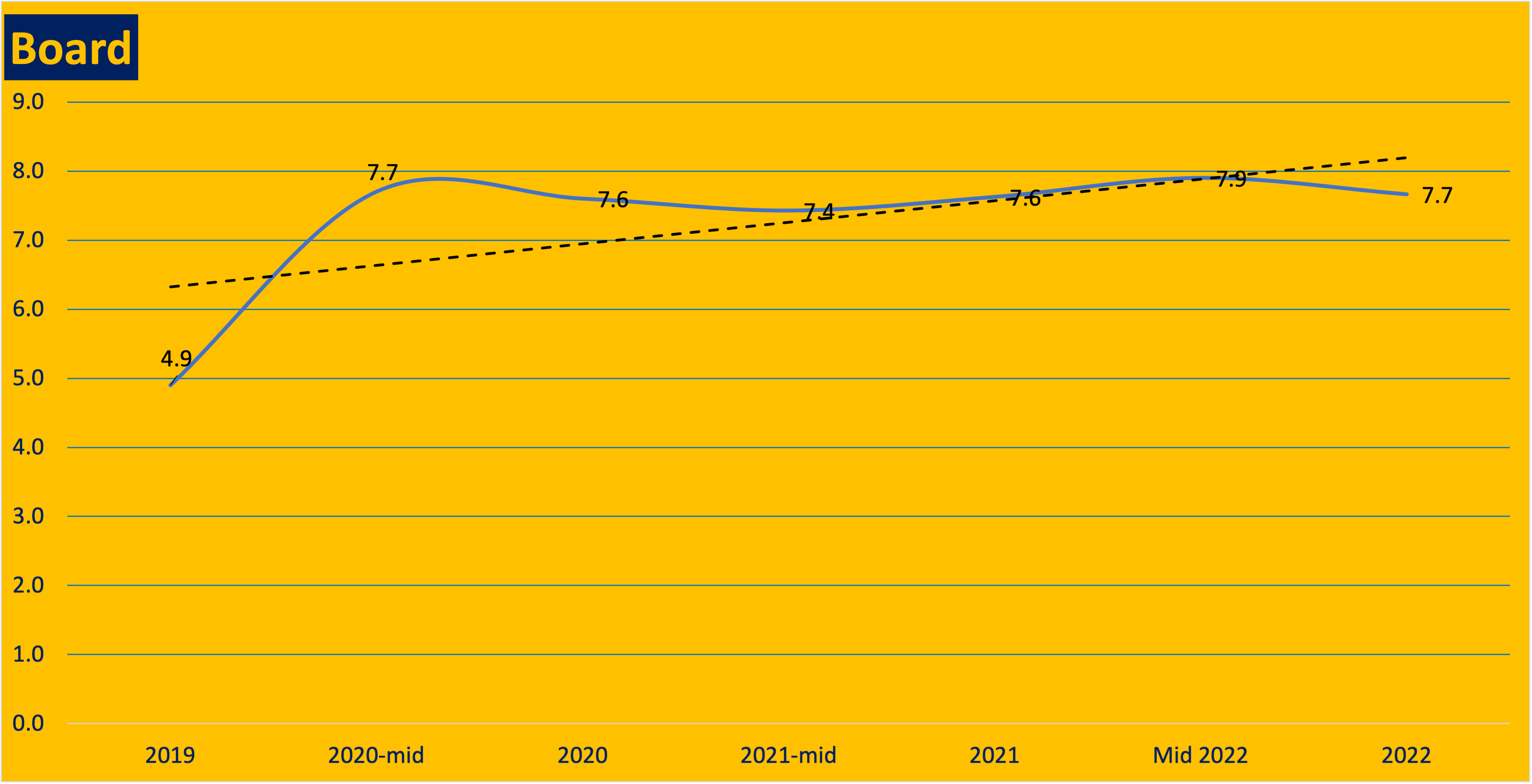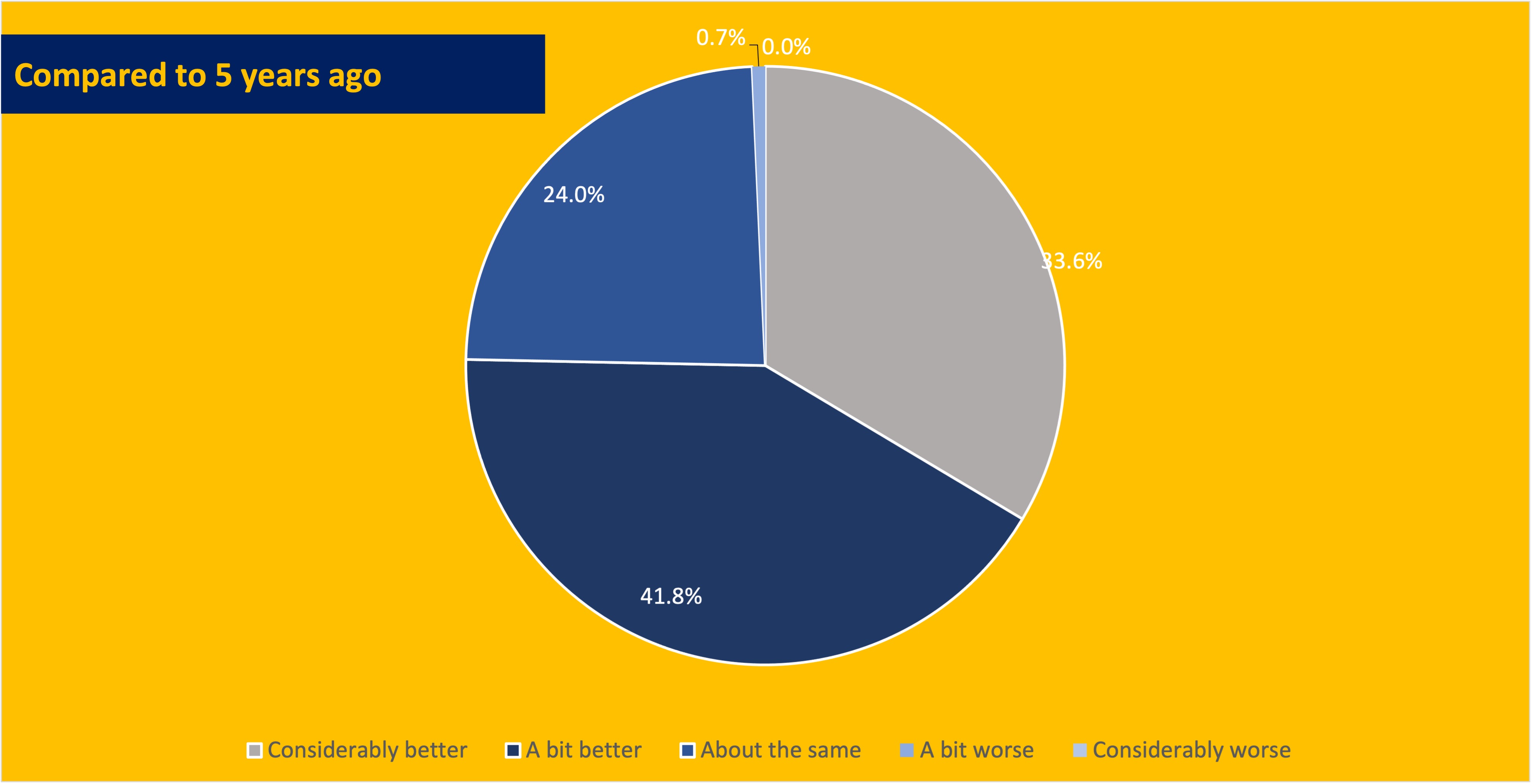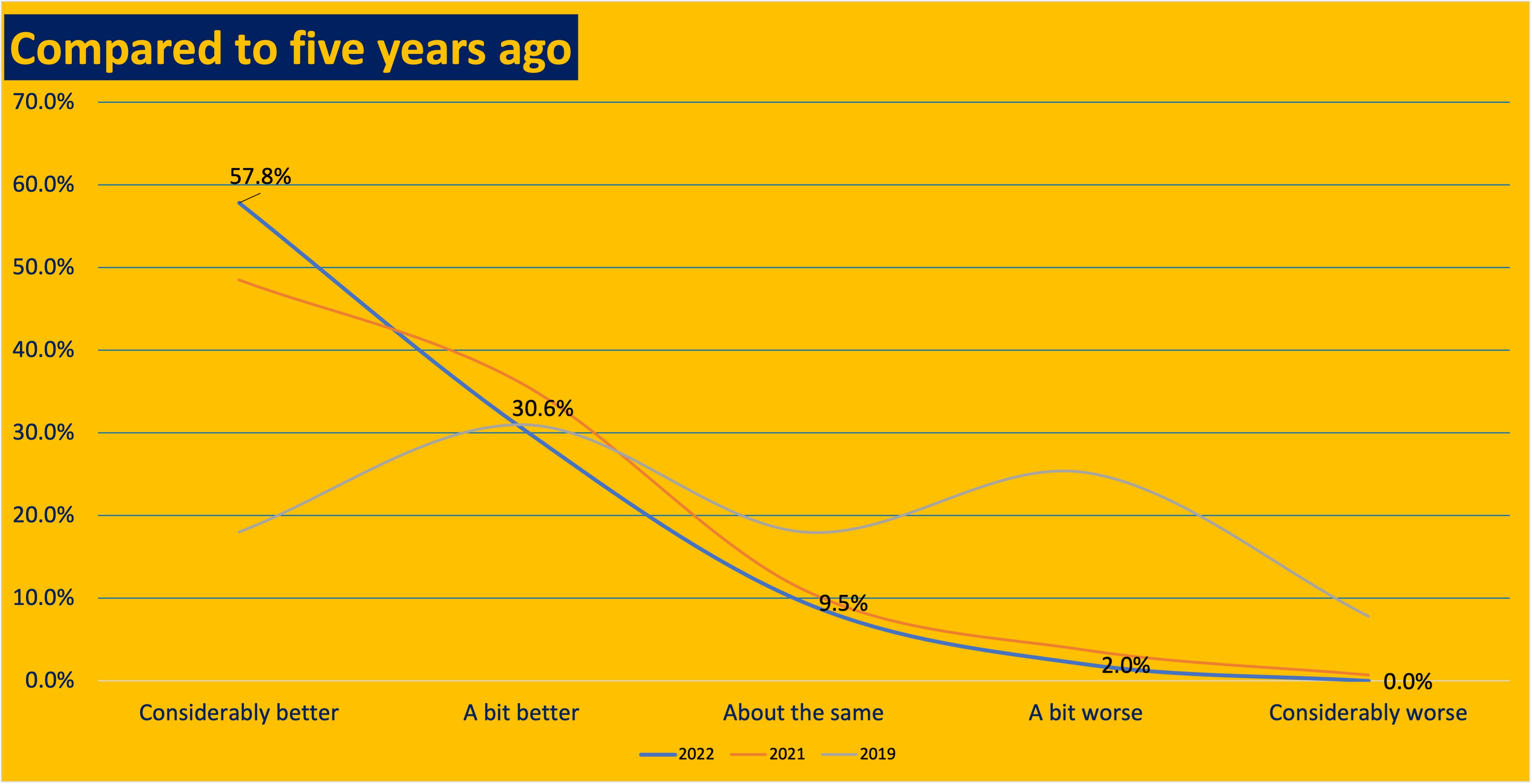 What you can see here his the growing satisfaction with our long term development. Back in 2019, the jury was out about whether the club was progressing with less than 20% thinking it was ‘considerably better’ even though we were in a higher division. Even last year, less than half thought things were considerably better, but there is quite a hop upwards for 2022.