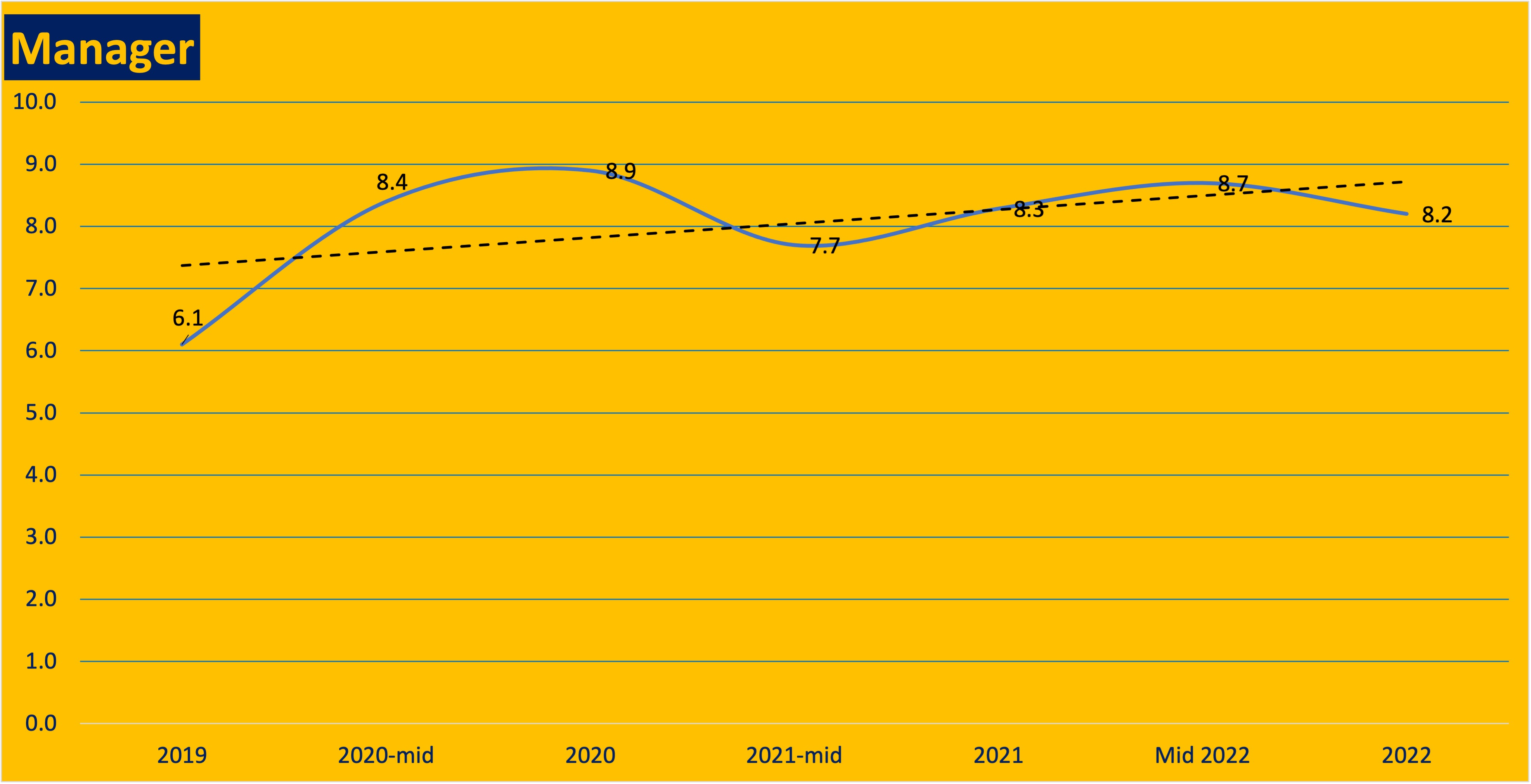 Karl Robinson’s rating has gone down from this time last year, but again by a tiny margin. There’s an obvious calming of the wave over the last eighteen months suggesting we are satisfied with his performance. We’re not on a rollercoaster ride of delight and disappointment. Looking back to 2019 and the first survey, when he was rated by 6.1 out of ten, this year’s rating of 8.2 shows a strong upward trajectory. But, again, have we become a bit spoilt and is patience running out?