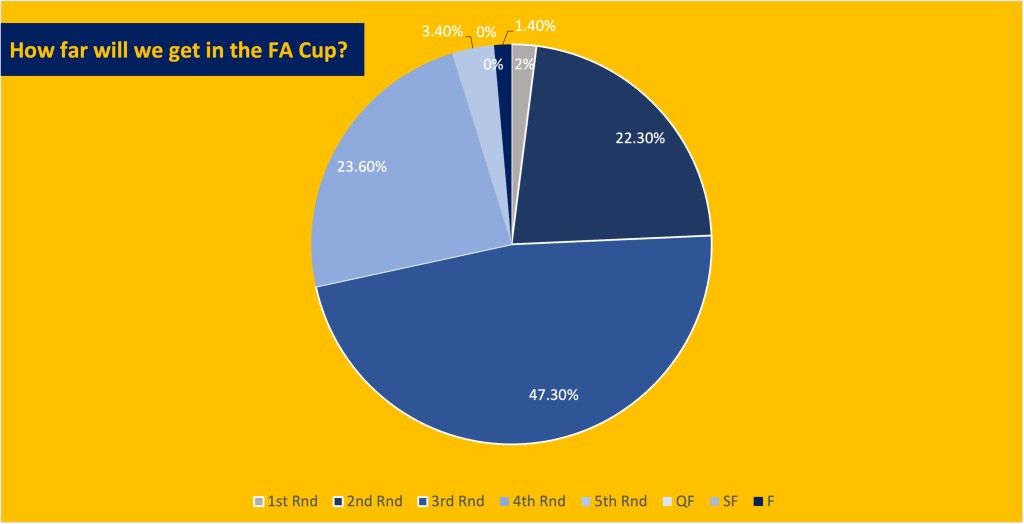 We’re a little less optimistic about our FA Cup prospects with nearly 75% of people think we’ll progress to the third round or beyond. Last year that number was 77%, so not much in it.