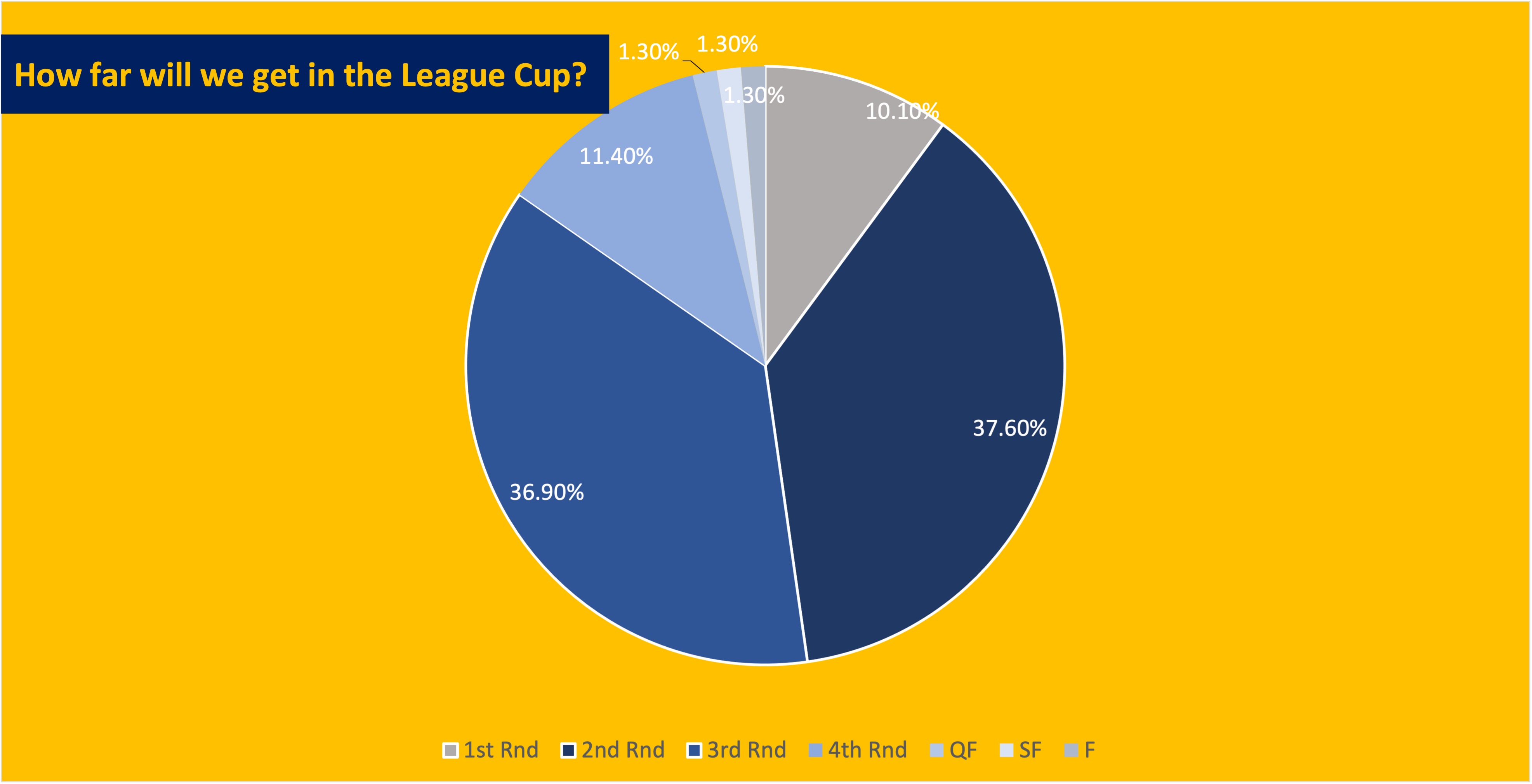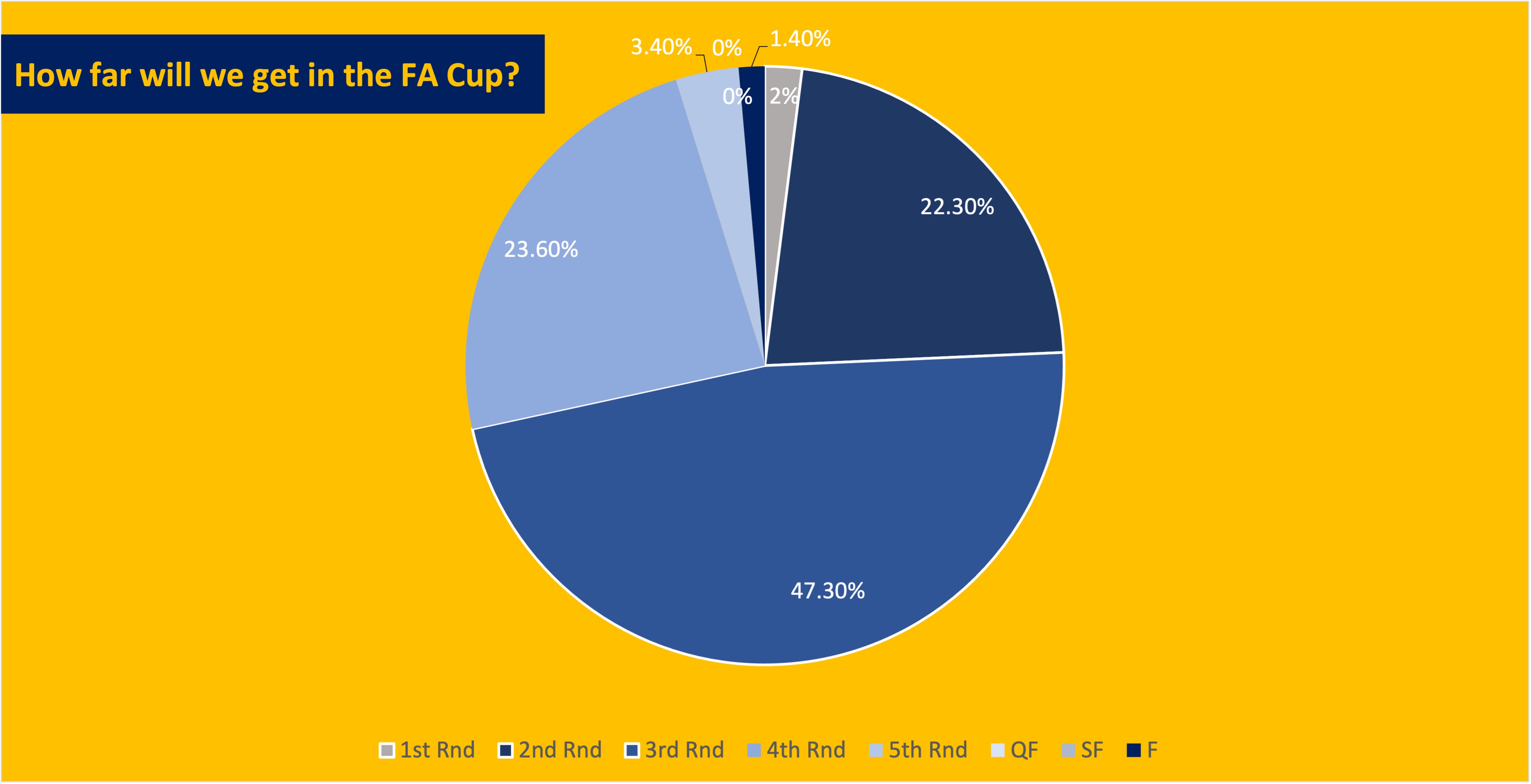 We’re a little less optimistic about our FA Cup prospects with nearly 75% of people think we’ll progress to the third round or beyond. Last year that number was 77%, so not much in it.
