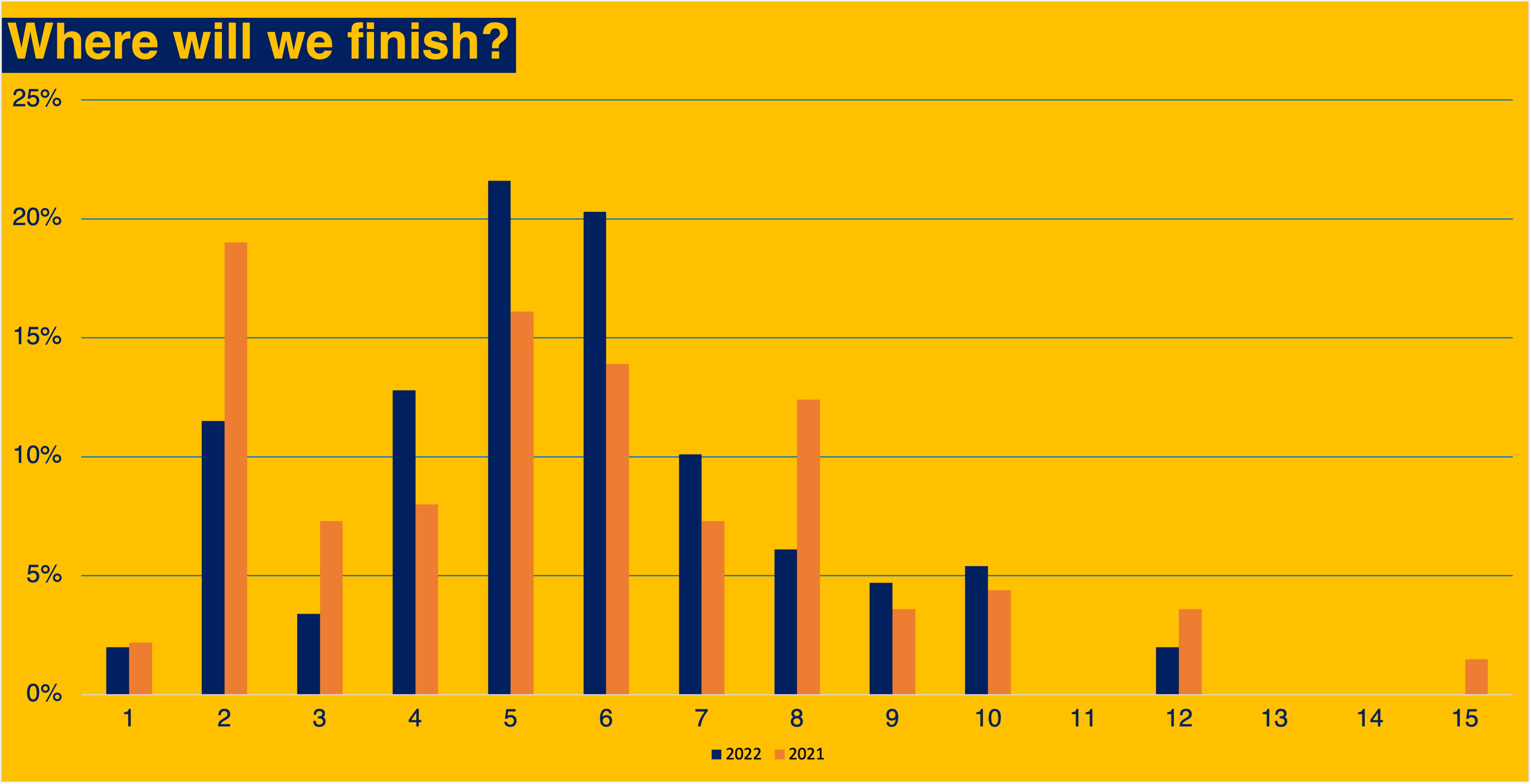 Last year’s votes were similar, second, fifth or sixth, but not first or third. Last year, the largest vote went to second place, this year, that’s dropped to fifth with sixth creeping up not far behind. A big drop in optimism. However, there was also a strong showing last year for eighth – outside the play-offs – and even votes for fifteenth. It seems we’re much more confident in reaching the play-offs, and more confident that we’ll avoid complete failure, but we’re less confident that we’re amongst the very best.
