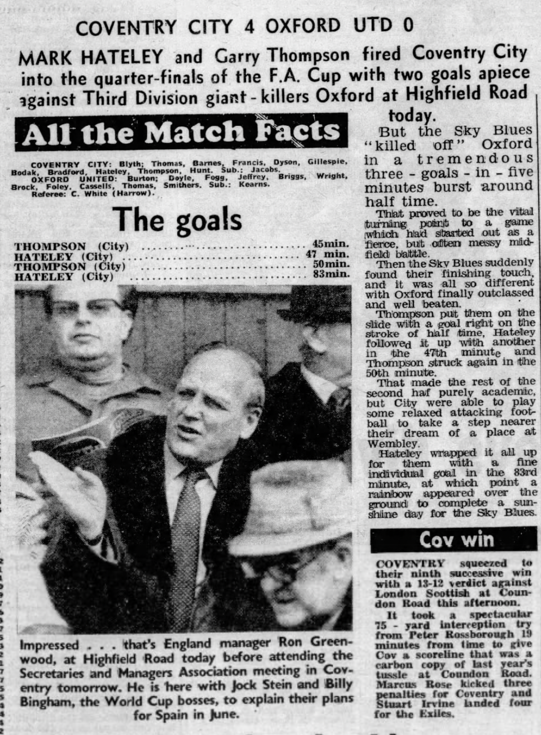 After beating Division One side Brighton 3-0 in the fourth round of the FA Cup, Oxford were drawn against Coventry City at Highfield Road. Despite the fine win, Oxford were a state of flux. The arrival of Robert Maxwell as chairman and owner put him on a collision course with the equally stubborn manager Ian Greaves.