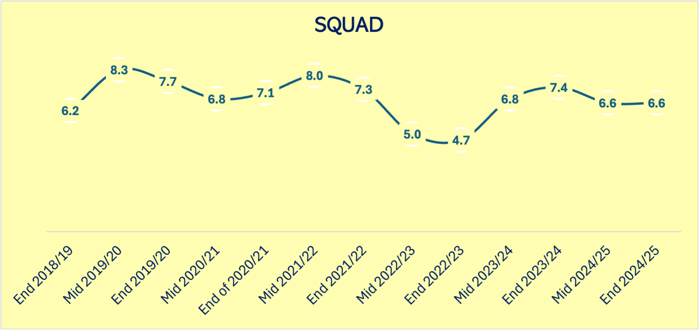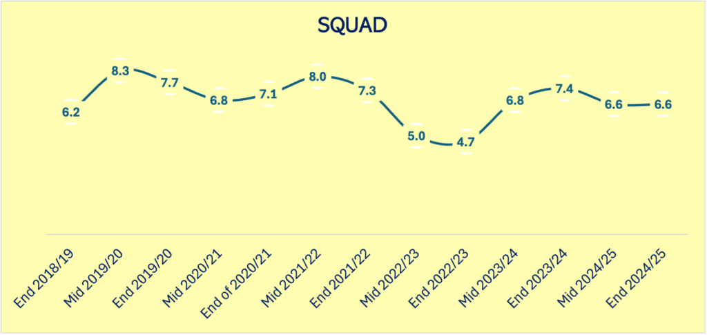So, given that we are generally happy with where we are as a club, the rating of 6.6 – the same as it was at Christmas – would suggest we think we’re good enough to sustain our happiness, which is probably the benchmark we need to set. But I’d say that we’re at the bottom of the ‘good enough’ spectrum. Relegation would surely see a dip in happiness, and given how close we were to going down, it wouldn’t take much to see us slip.