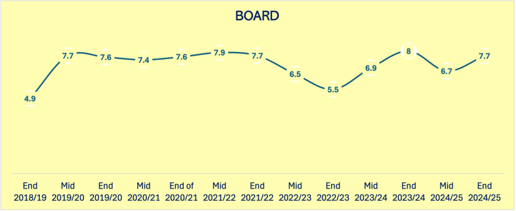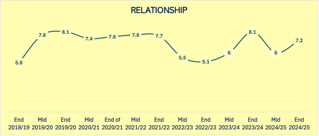 Much like the board, the relationship bounced back from last Christmas but lagged behind our promotion peak. Things have been surprisingly volatile in recent years, so it’s hard to say whether 7.2 represents a good score or a bad one.