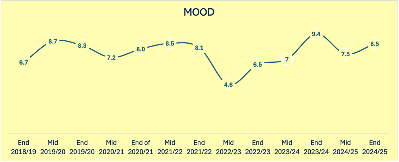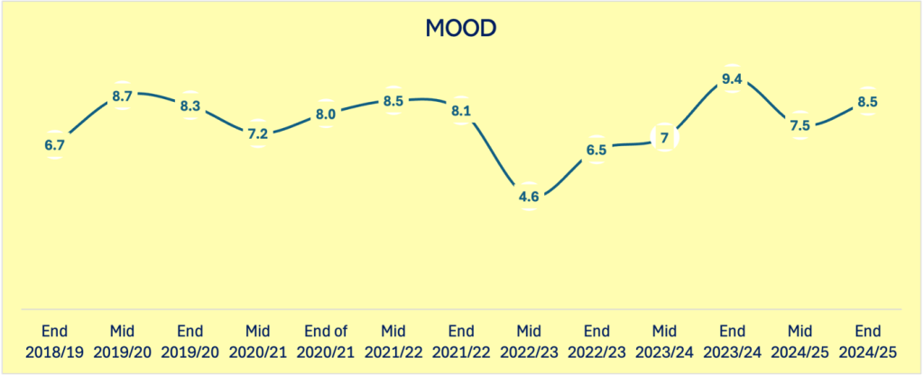 Our club, in the main, exists to make people happy, a largely unquantifiable measure. Still, we try. You ranked your mood at the end of the season as 8.5/10. This was an increase since Christmas, but a drop since this time last year. However, the post-promotion 9.4 was undoubtedly fuelled by a series of unexpected and unusual results. That adrenaline shot is a bit like my son’s friend who was so excited to see Billy Eilish recently her heart rate hit 194. It’s not a rate you can expect to sustain.