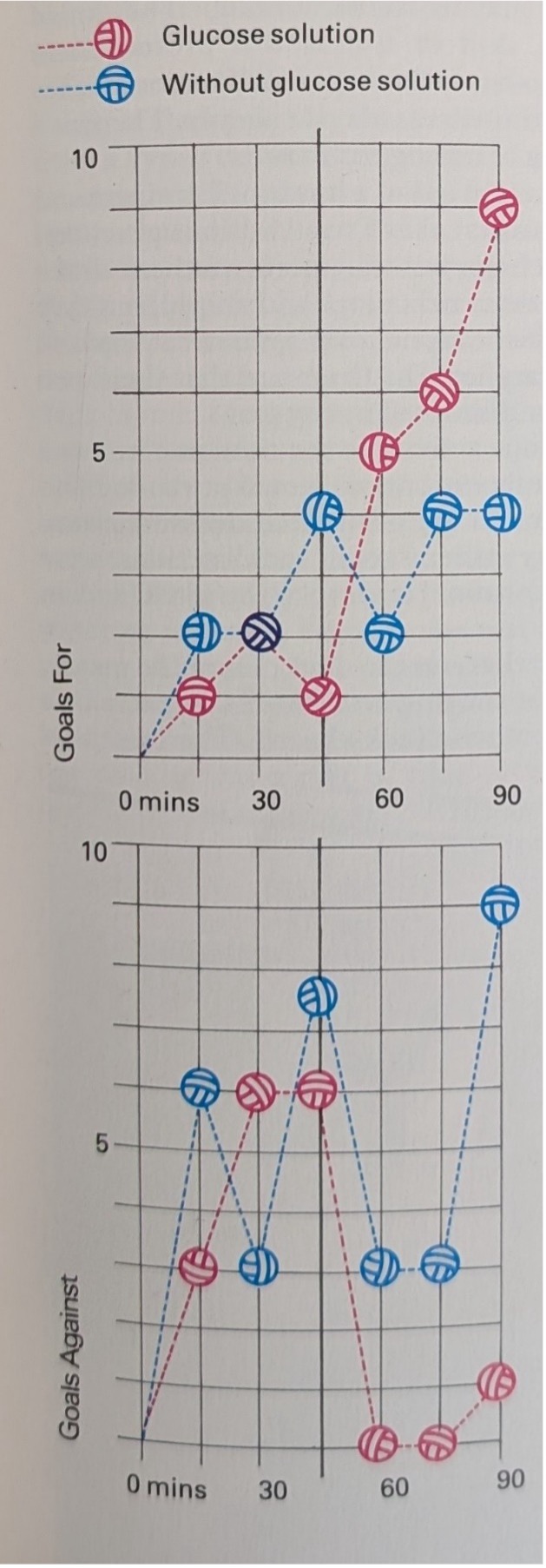 This graph shows the results of an experiment at Oxford United in the 1972/3 season. On the Thursday before a Saturday game, players were “trained to exhaustion” and then rested until the game itself. On Friday they were fed a high-glucose diet and then kept relaxed until kick-off to avoid “prolonged adrenaline flow”. Over the 20-game experiment the results were remarkable – as you can see from the graph in the final stages of the match, goals-scored was hugely up and goals-conceded significantly down.
